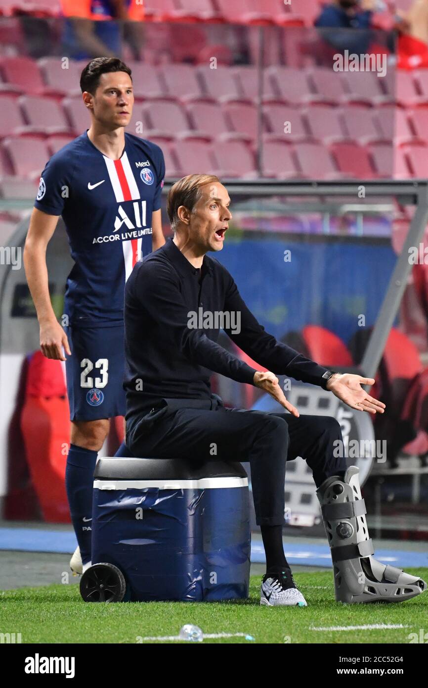 Lisbon Lissabon Portugal 18th August 2020 Thomas Tuchel Psg Trainer Sits With A Bandaged Leg On A Cool Box Julian Draxler Psg 23 In The Semifinal Match Uefa Champions League Final Tournament